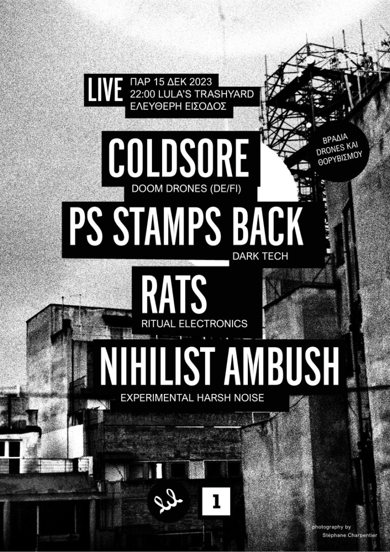 Την Παρασκευή 15 Δεκεμβρίου το στούντιο Lula’s Trashyard οργανώνει, σε συνεργασία με τον Πρώτο Όροφο, μία βραδιά drones και θορυβισμού με live electronics από τους Coldsore από την Φινλανδία, PS Stamps Back, Rats και Nihilist Ambush.