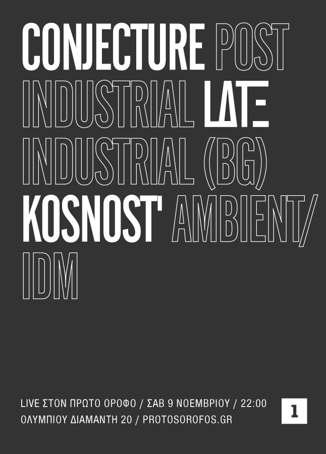 To Σάββατο 9 Νοεμβρίου στις 21:30 ο Πρώτος Όροφος θα φιλοξενήσει για μια συναυλία τους Conjecture από Αθήνα, LΔΤΞ από την Βουλγαρία και τους Kosnost’.
