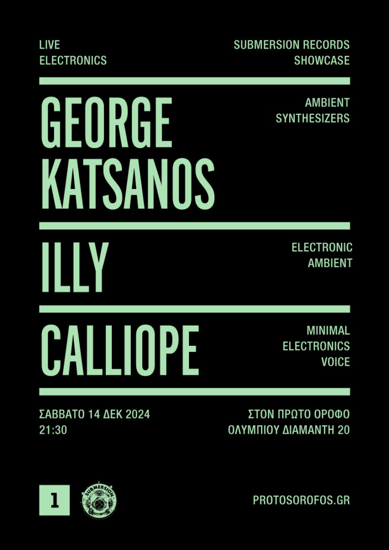 To Σάββατο 14 Δεκεμβρίου ο Πρώτος Όροφος θα φιλοξενήσει για μια συναυλία τον Γιώργο Κατσάνο, την Illy και την Calliope στα πλαίσια της παρουσίασης της Submersion Records.