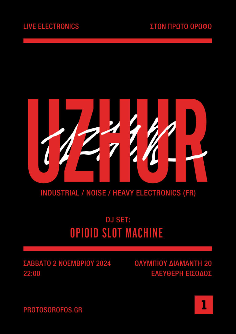 Οι Uzhur είναι ένα ντουέτο, με έδρα το Παρίσι, εμπνευσμένο από την industrial, τη doom, τη noise μουσική και τη “βαθιά ακρόαση”. Κυκλοφόρησαν το πρώτο τους LP το 2023 σε βινύλιο στην Nahal Recordings. Ο Jean-Charles Bastion και ο Fabien Rios χρησιμοποιούν ένα μείγμα ηλεκτρονικών οργάνων με ηλεκτρικές κιθάρες και φωνητικά για να εξερευνήσουν μια βίαιη όσο και ποιητική αισθητική με feedback και interconnections. Η μουσική τους παραπέμπει σε μετα-αποκαλυπτικά τοπία με επεξεργασμένα φωνητικά που θυμίζουν μάντρας. Στην συναυλία στον Πρώτο Όροφο θα συμμετάσχει και ο φωτιστής/video artist των Uzhur, Greg Orio.